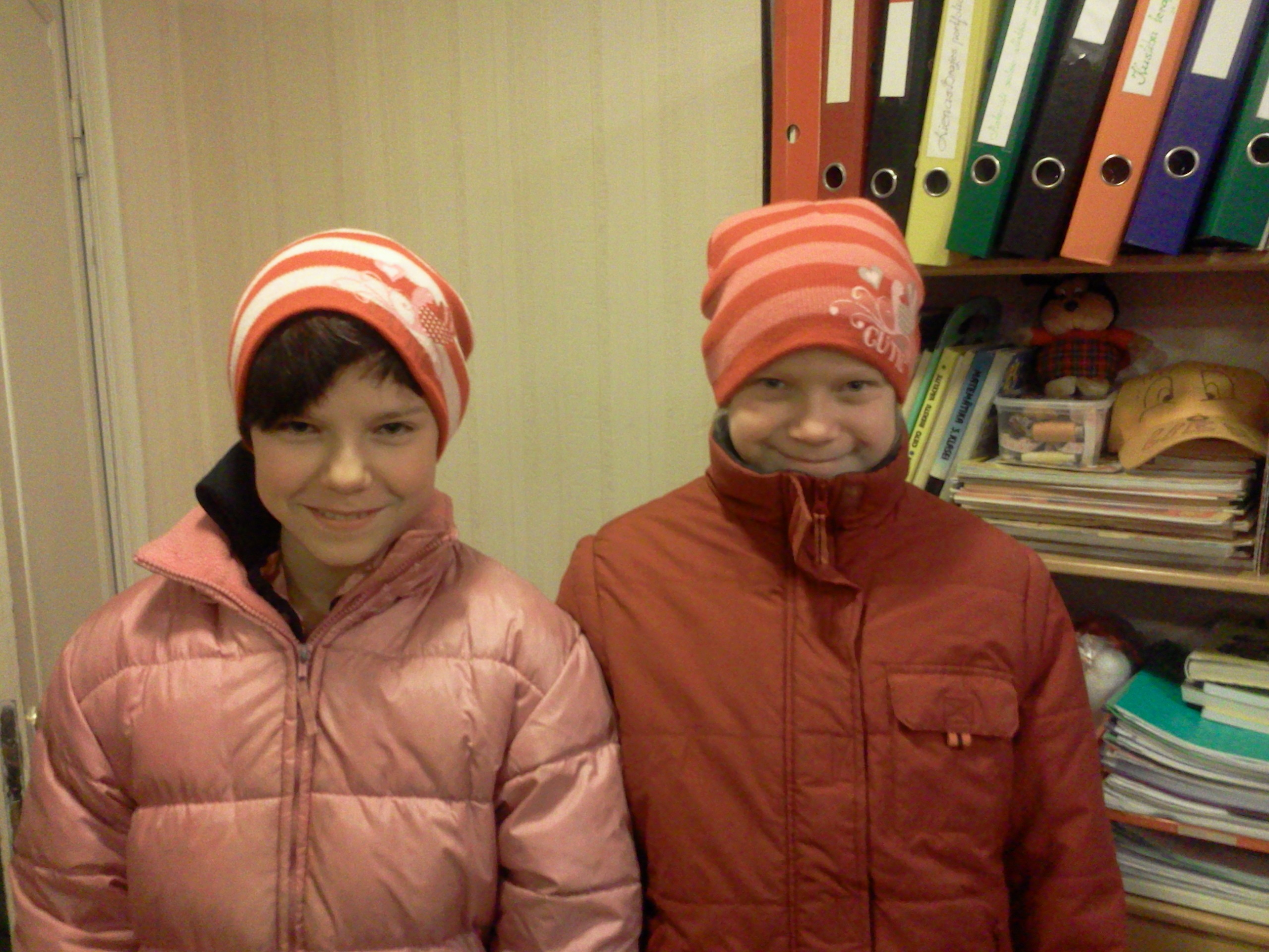 Her til venstre ser vi to glade jenter med nye boblejakker og luer.